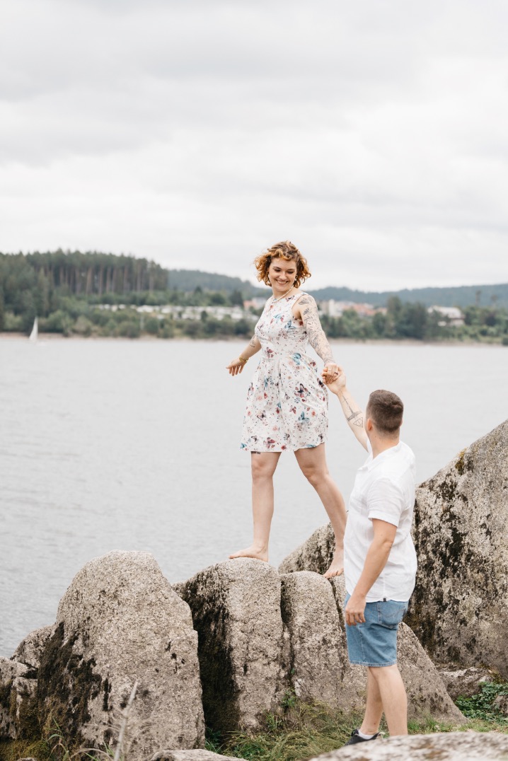 Nach dem Antrag sind wir noch ein Stück am Ufer entlanggelaufen, haben die Felsen an der Kaiserbucht genutzt und ein paar verspielte, leichte Paarfotos gemacht – barfuß auf den Steinen, Hand in Hand, viel Bewegung.